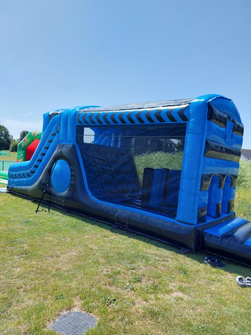 The 30ft inflatable obstacle course is designed for high-energy fun and includes a series of challenges such as tunnels, pop-up obstacles, and climbing walls. Participants race through the course, testing their agility and endurance, before finishing with a slide at the end, which adds an exciting conclusion to the course.